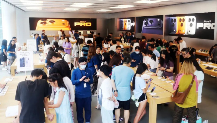 上海苹果智能产品旗舰店内,新上市不久的iPhone17系列手机人气旺。图片
