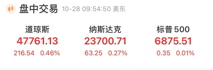 北京时间10月28日晚,美股三大指数小幅高开,道琼斯指数涨0.65%宝牛E配,标普500指数涨0.31%,纳斯达克综合指数涨0.54%,均刷新历史新高。