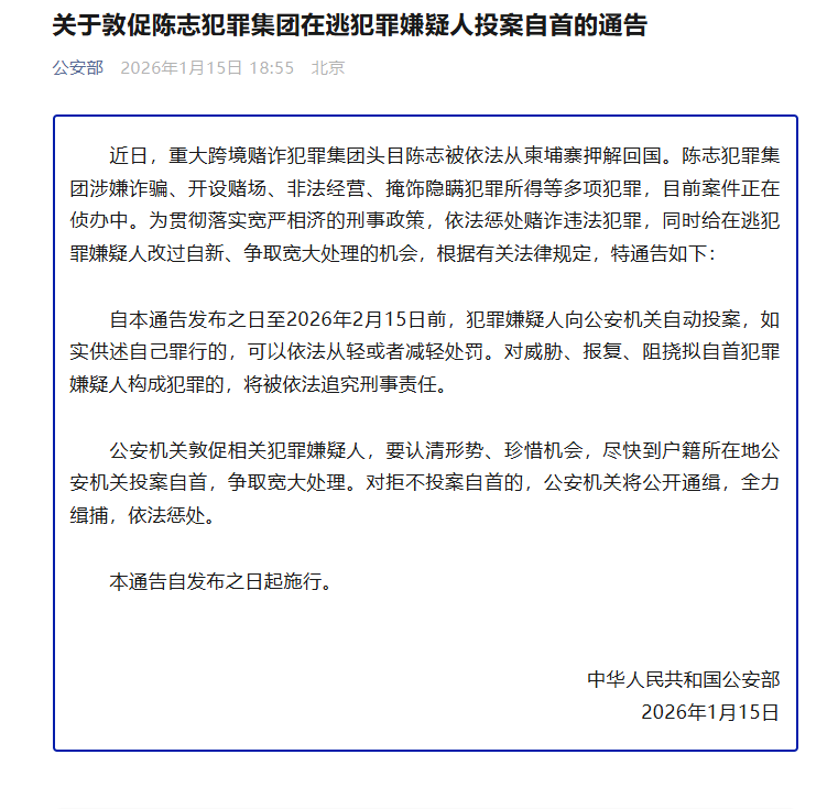 1月15日,公安部发布《关于敦促陈志犯罪集团在逃犯罪嫌疑人投案自首的通告》。近日,重大跨境赌诈犯罪集团头目陈志被依法从柬埔寨押解回国。陈志犯罪集团涉嫌诈骗、开设赌场、非法经营、掩饰隐瞒犯罪所得等多项犯罪,目前案件正在侦办中。为贯彻落实宽严相济的刑事政策,依法惩处赌诈违法犯罪,同时给在逃犯罪嫌疑人改过自新、争取宽大处理的机会,根据有关法律规定,特通告如下: